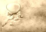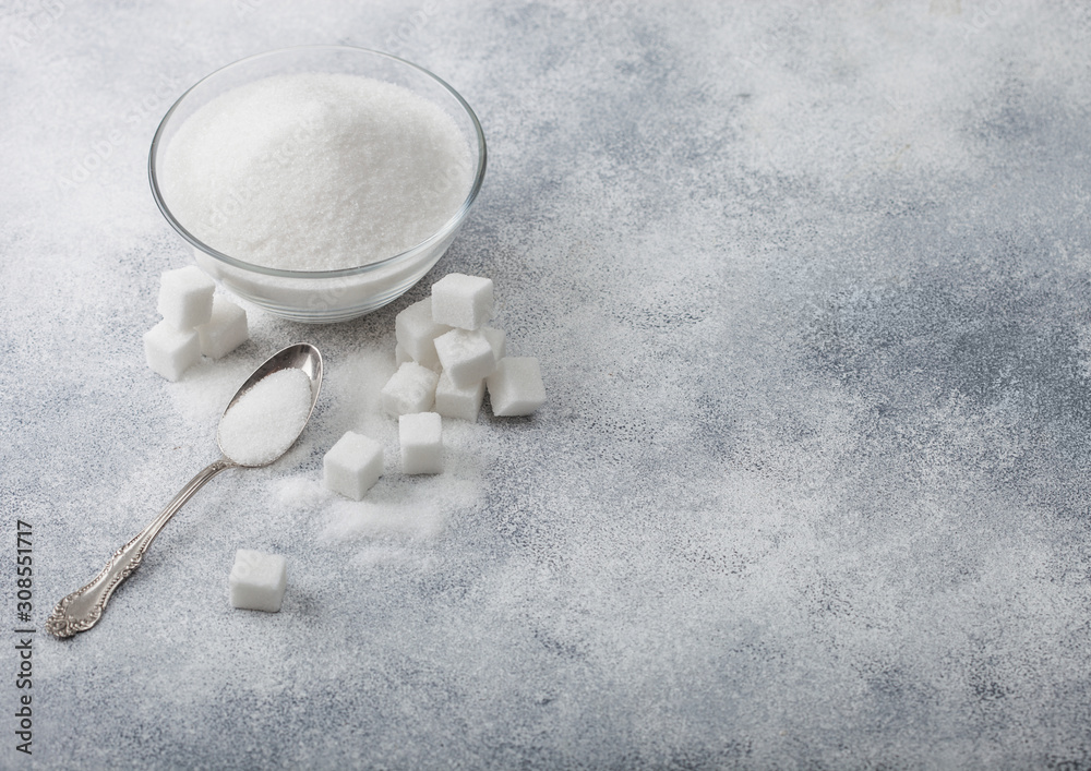 Glass bowl of natural white refined sugar with cubes and silver spoon on light table background. Space for text