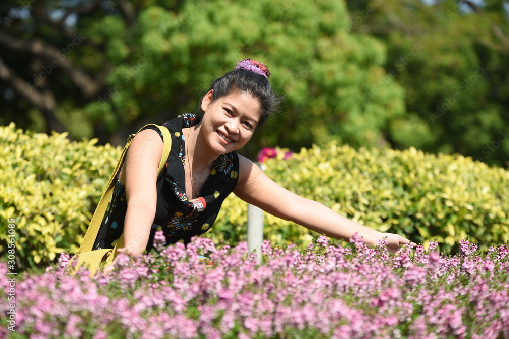 Woman lying in Flowers garden,Colorful carp in the fish pond at the garden