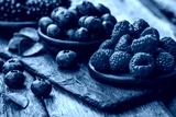 Fresh berries with raspberries, blueberries, blackberries in bowl on a stone stand on wood background.