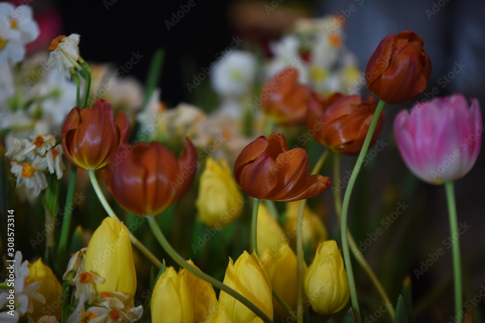 Closeup of beautiful tulips. Spring flowers blossom background. Fresh plant in garden.