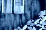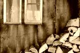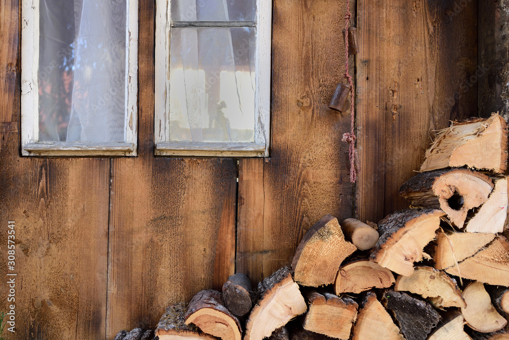 Background of an old romantic weathered wooden wall with an old window, a cord with bells in front of it and firewood