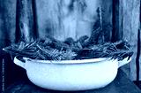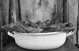 An old enameled bowl filled with fresh fir branches stands against a wooden background