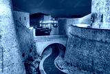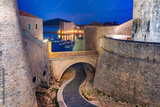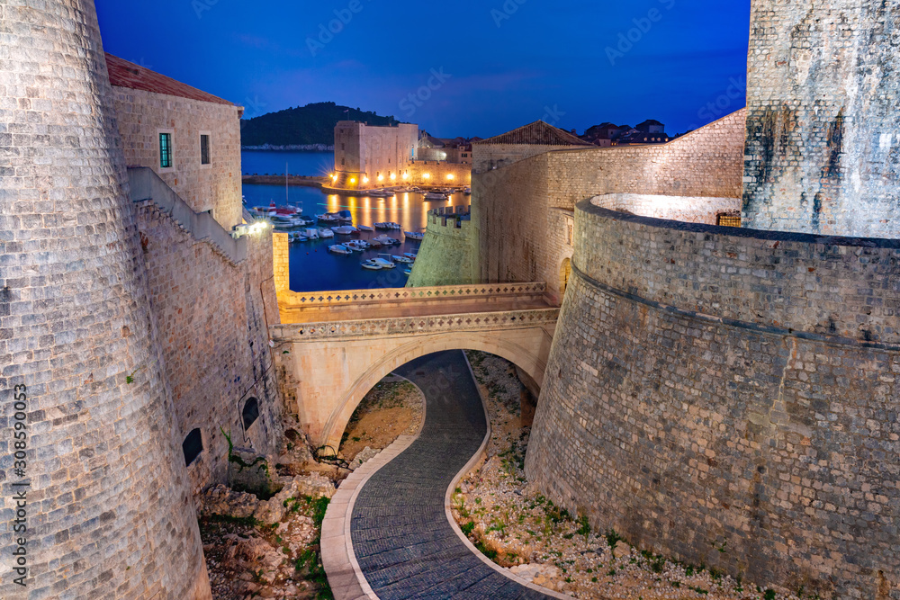 Old city walls and Old Harbour of Dubrovnik at night in Dubrovnik, Croatia