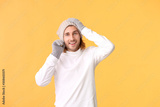 Handsome man in winter clothes on color background