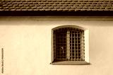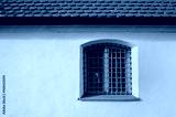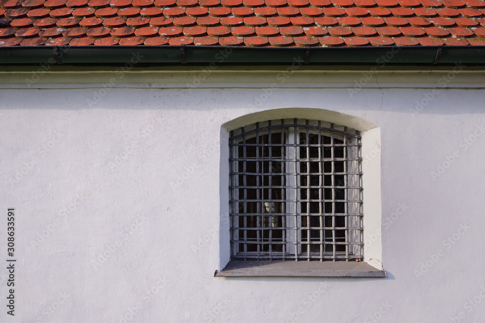 Old historic white plastered and weathered facade with a window and a grid of iron in front of red roof as background in Bavaria