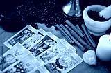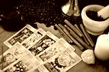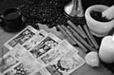 Tarot cards and fortune telling, canvas napkin background, coffee сup and coffee beans