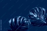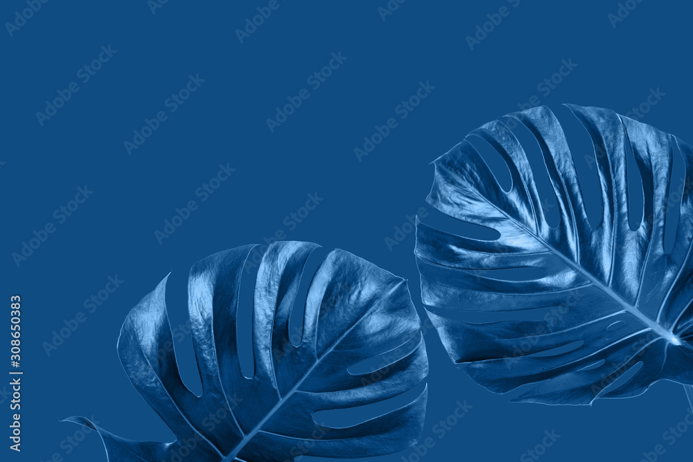The tropical frame with monstera leaves in the blue classic color of the 2020 year. Concept of the color of the year.
