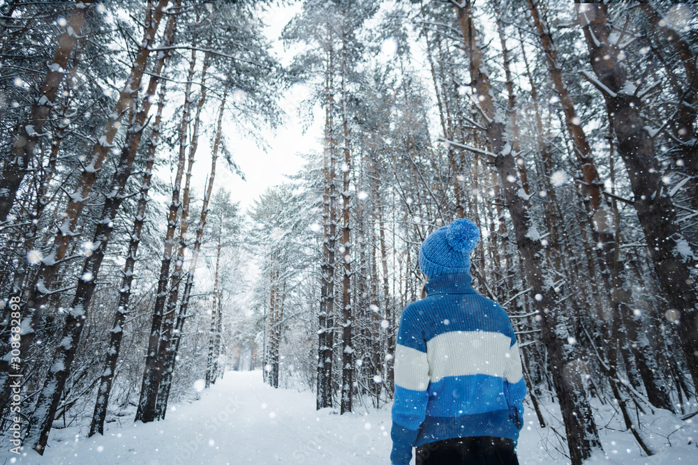 Rear view of adult woman standing in snowy forest.