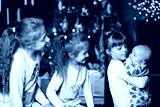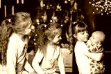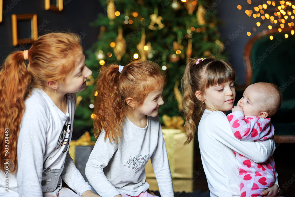 Children play near the Christmas tree. The concept of Merry Christmas, holidays, New Year, family and gifts.