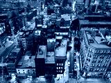 Overhead view of the busy streets of Nolita and SoHo neighborhoods with colorful night lights shining at dusk in Manhattan, New York City