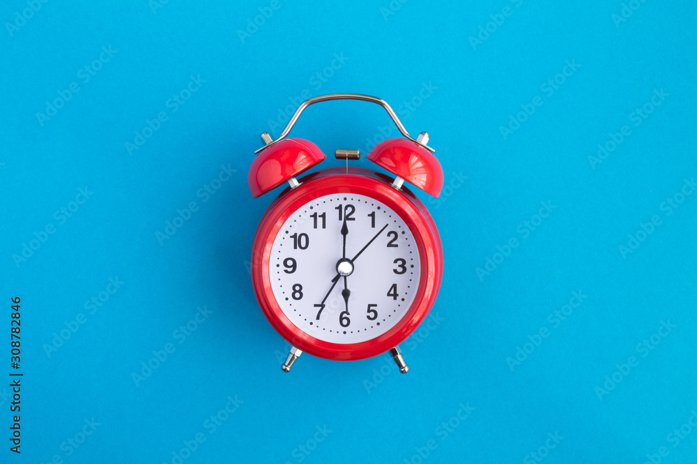 Red alarm clock in the center of the blue background. Top view. Copy space.