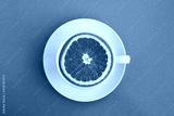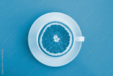White tea cup with blue halved orange in middle on the blue background. Top view. Copy space. Creative food collage.