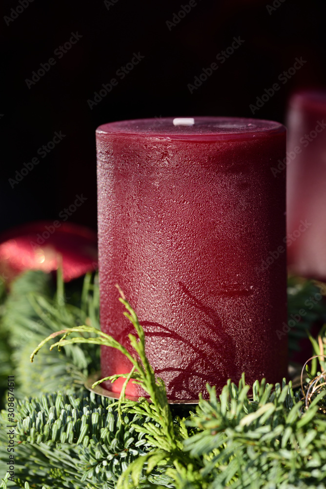 Closeup of a red christmas big candle surrounded by green branches against dark background with space for text