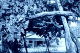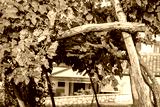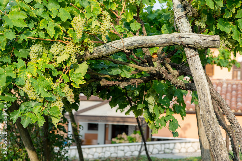 Rural landscape. A vine of white grapes tied to a trellis, against the background of a village house. Selective focus.