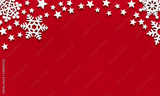Christmas minimal mockup of white snowflakes and stars on red paper background. Flat lay, top view. New year winter banner or header decoration.