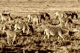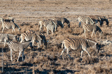 A group of Burchell's Plains zebra -Equus quagga burchelli- standing close to each other on the plains of Etosha National Park, Namibia.