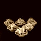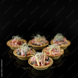 Delicious appetizer with ham, cheese, pepper and tomato in tartlets. Concept of food, restaurant, catering, menu