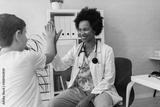 Smiling female afro american doctor general practitioner talks and amuses child before medical examination