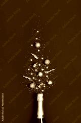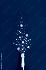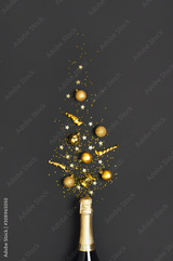 Christmas and New Year background. Champagne bottle, golden christmas balls, festive ribbons, star confetti on black background top view. Flat lay holiday card. Party concept Festive decorations 2020