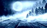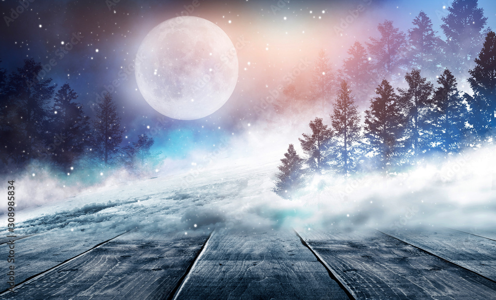 Winter background. Winter snow landscape with wooden table in front.