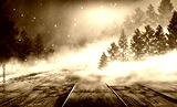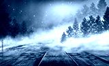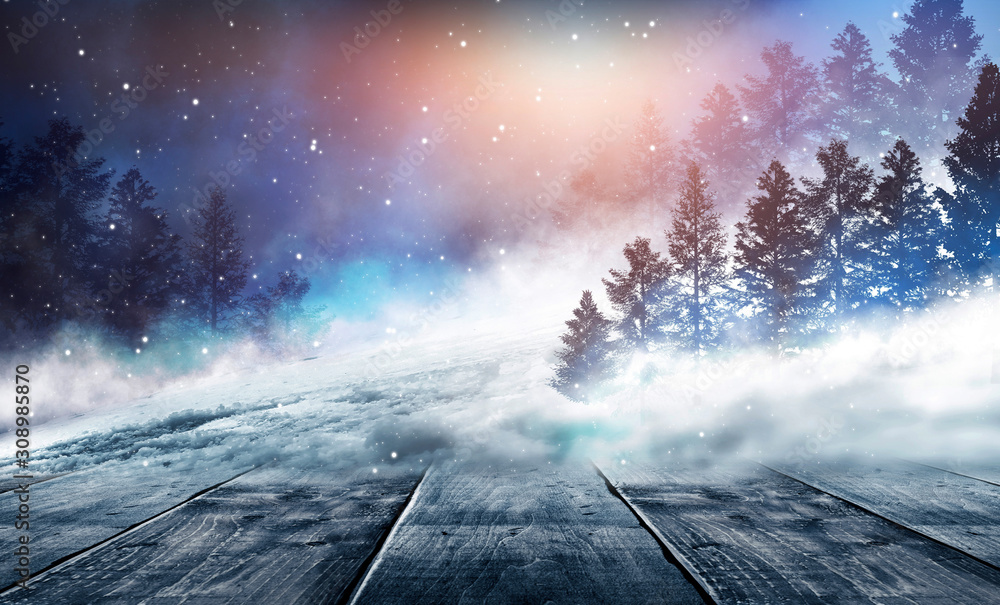 Winter background. Winter snow landscape with wooden table in front.