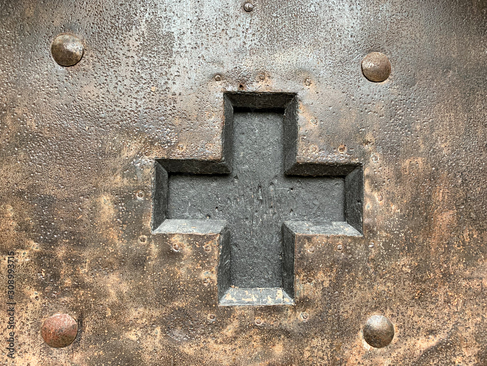 Cutted out black cross in an iron door with rivets, nails and screws. Old metal fitting from the Middle Ages, weathered, oxidized and preserved. Rusty and rough metal surface.