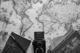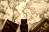 top view of vintage camera, notepad with fountain pen and painting on map background