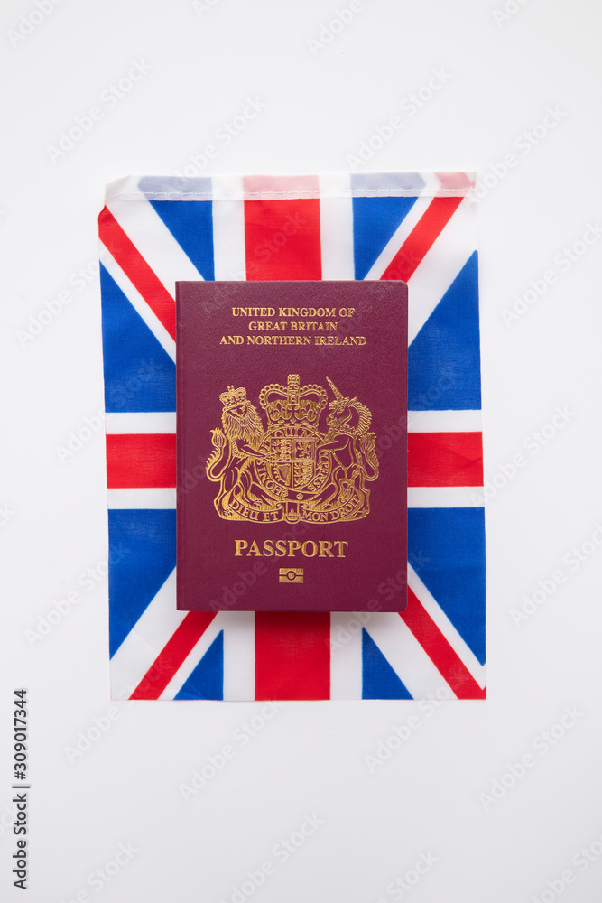 United Kingdom travel passport on a Great Britain Union Jack flag