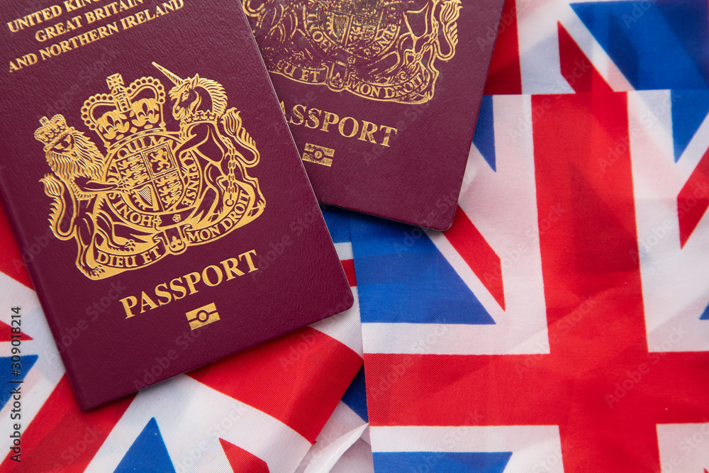 United Kingdom travel passport on a Great Britain Union Jack flag