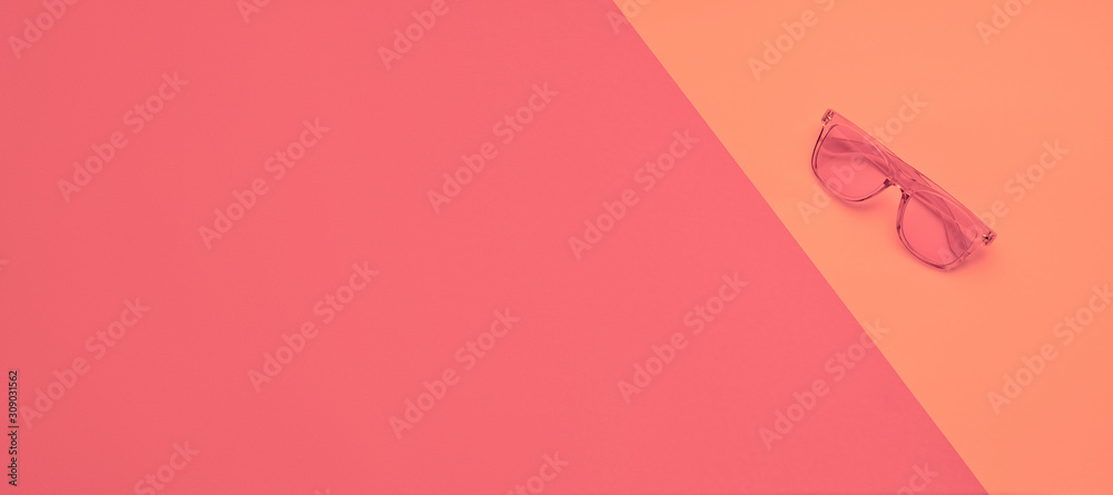Minimal fashion, Trendy sunglasses. Party vibration on pink geometry background. Hipster accessory Flat lay. Art creative summer vibes fashionable style. Design vibrant color, gel filter. Top view