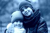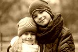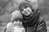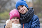 Two children boy and girl hugging each other outdoors wearing warm clothes in cold autumn or winter weather.