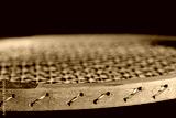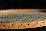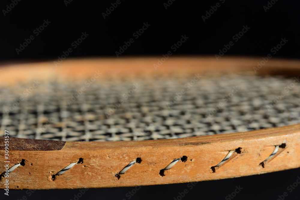 Close-up and detail shot of an old wooden tennis racket in front of dark background
