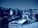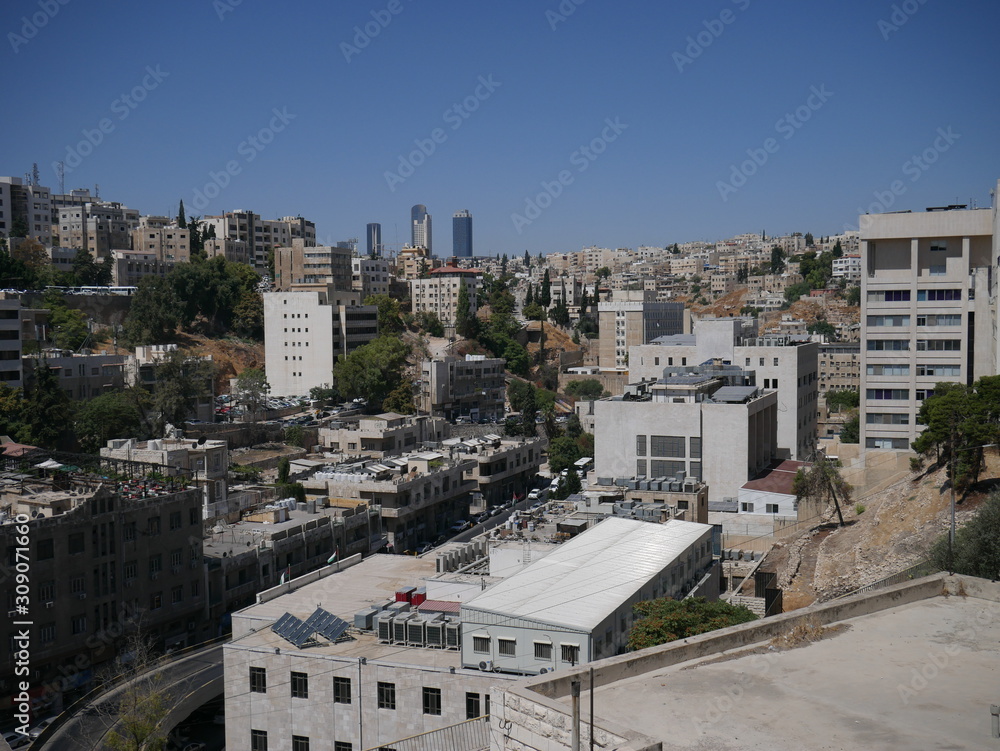Cityscape of Amman, capitol of Jordan, grey panorama of a modern Arabic city with improvised houses on a hill between few green trees and a tall flag of the country under the blue sky