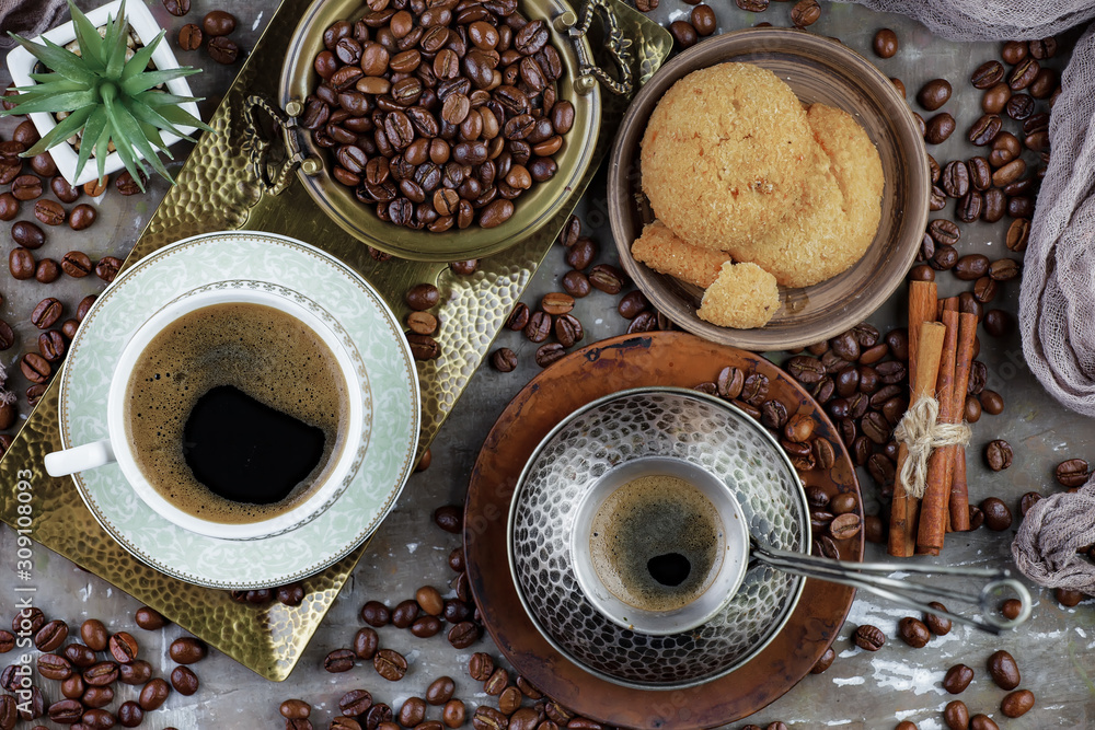 Black coffee beans roast in a pan in the smoke