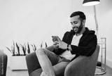 Trendy handsome Gen z Indian arabic man typing on mobile phone, sitting in waiting room before interview