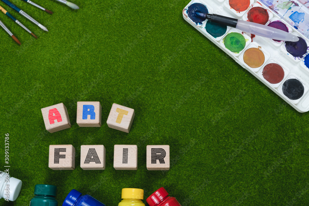 Art trade fair flat lay concept written on wood blocks on grass background - Creative overhead backdrop poster banner with artistic tools and copy space - Exhibition, shopping and painting concepts