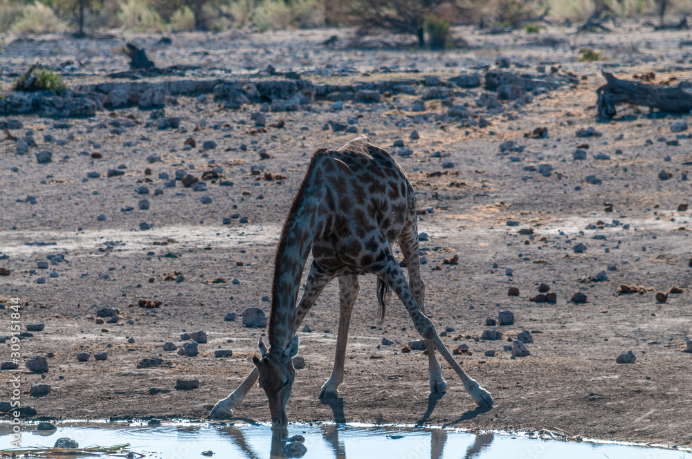 Backlit image of one Angolan Giraffe - Giraffa giraffa angolensis- is drinking from a waterhole in Etosha National Park. Giraffes are the most vulnerable when drinking.