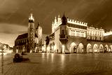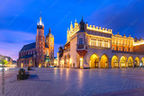 Medieval Main market square with Basilica of Saint Mary and Cloth Hall in Old Town of Krakow at sunrise, Poland