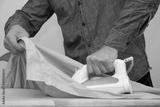 A man of about 30 years irons his clothes with an iron, leads a bachelor lifestyle, is going to visit or to a meeting, on a date, help for a woman.