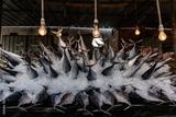 Street fish market. Fresh catch of fish in ice.