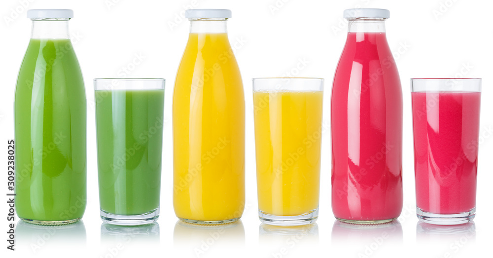 Fruit juice fruits orange drink in glass and bottle isolated on white