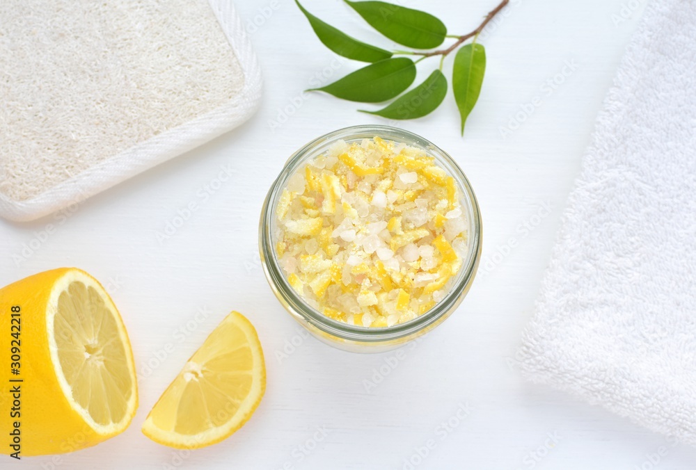 Lemon peel and sea salt body scrub, natural homemade cosmetics, top view.