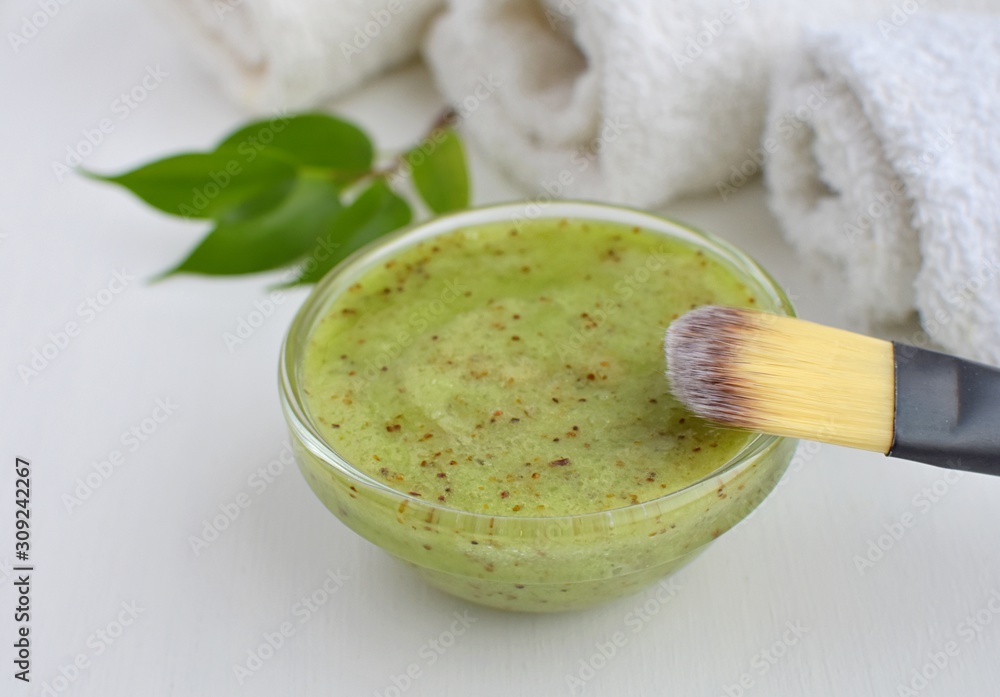 Natural acne skin treatment, kiwi fruit mask, cosmetic brush, homemade cosmetics.