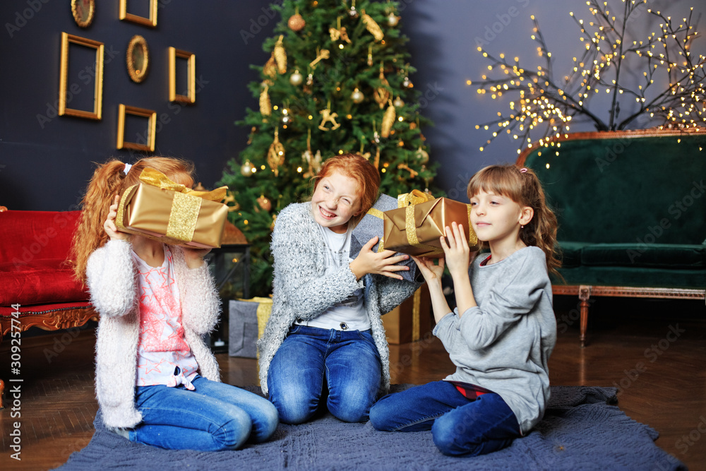 Happy children received presents for Christmas. The concept of holidays, Merry Christmas, holidays and family.