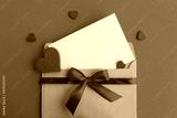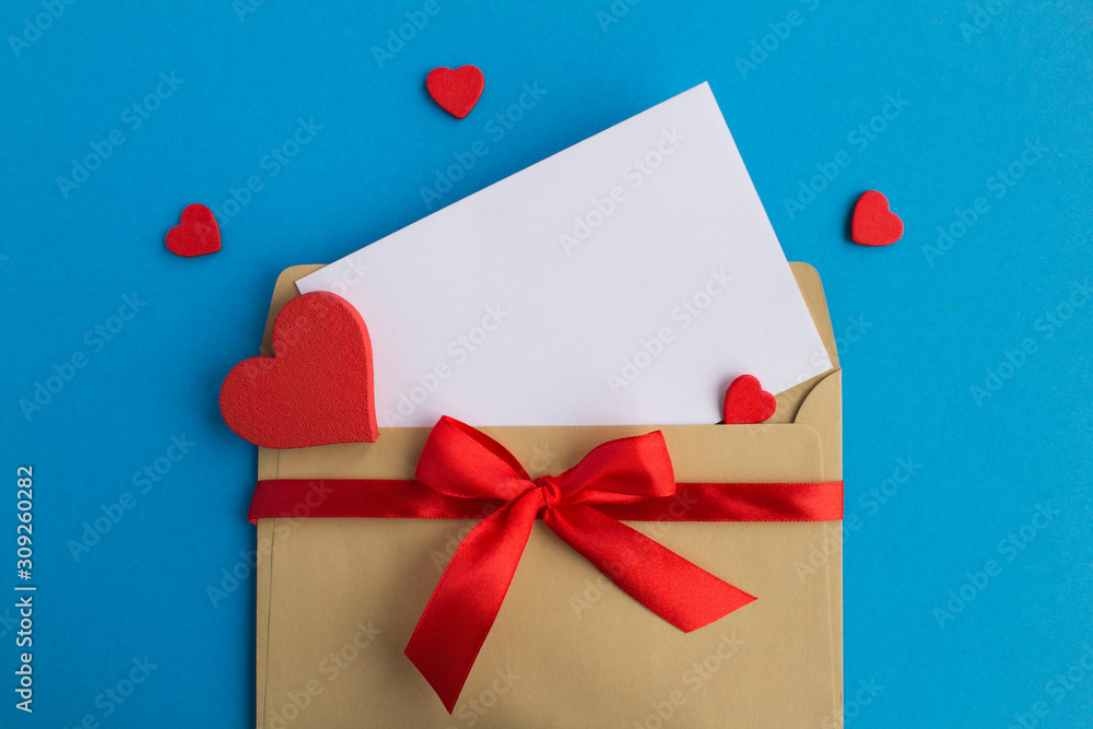 Blank white paper for text, envelope and red hearts on the blue background. Copy space. Top view.