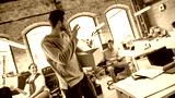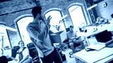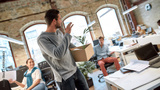 Follow your dreams, quit your job. Handsome man in casual wear holding box with personal things and saying good bye to his ex-colleagues while leaving modern office