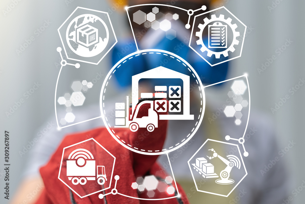 Smart Warehouse Forklift Business Industry Distribution Concept. Storehouse IOT Automation Technology.