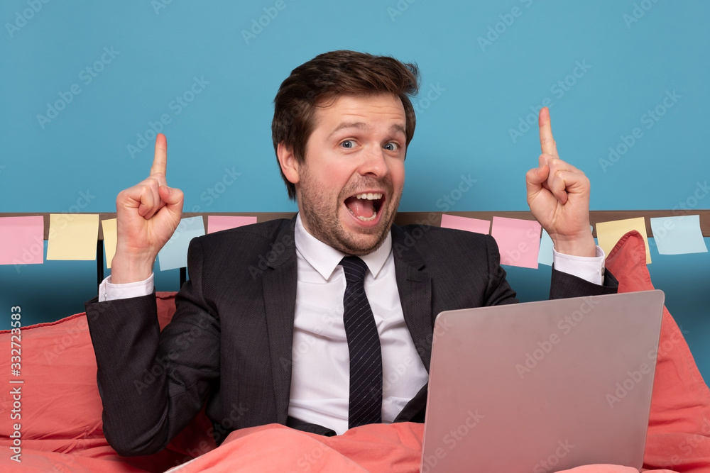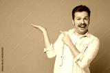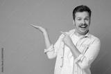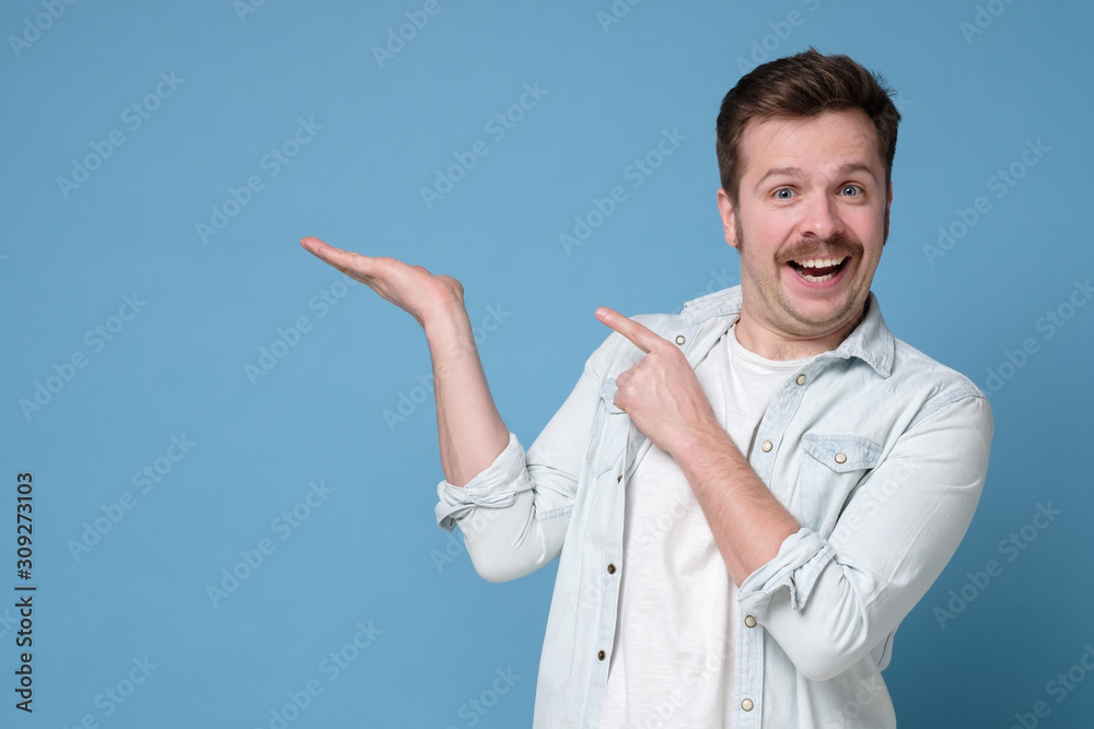 Man with mustache show empty copy space on open palm gesture for your ad, demonstrate advertise product