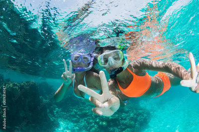 two Young girls snorkeling in blue clear waters having fun at caribbean beach