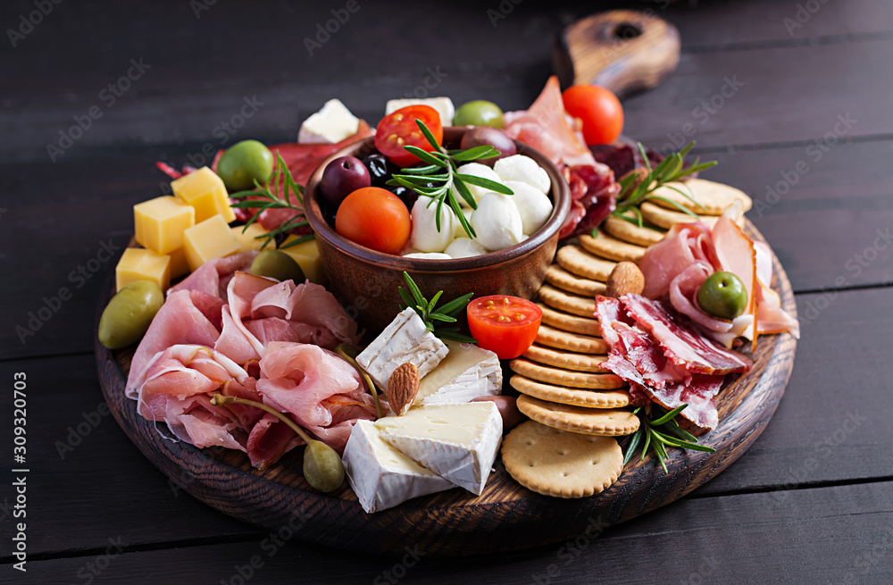 Antipasto platter with ham, prosciutto, salami, cheese, crackers and olives on a wooden background. Christmas table.